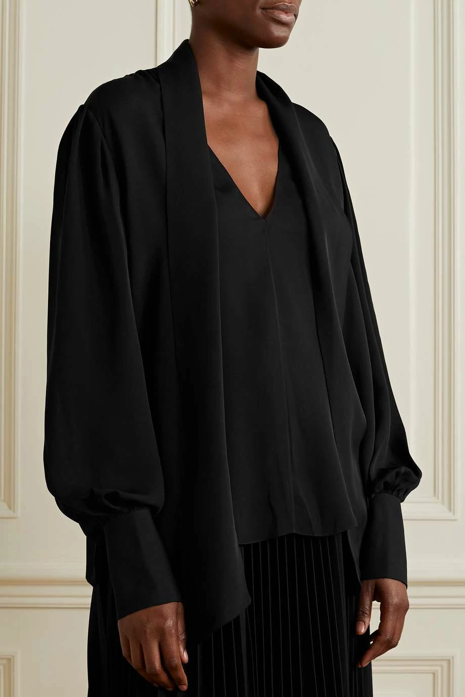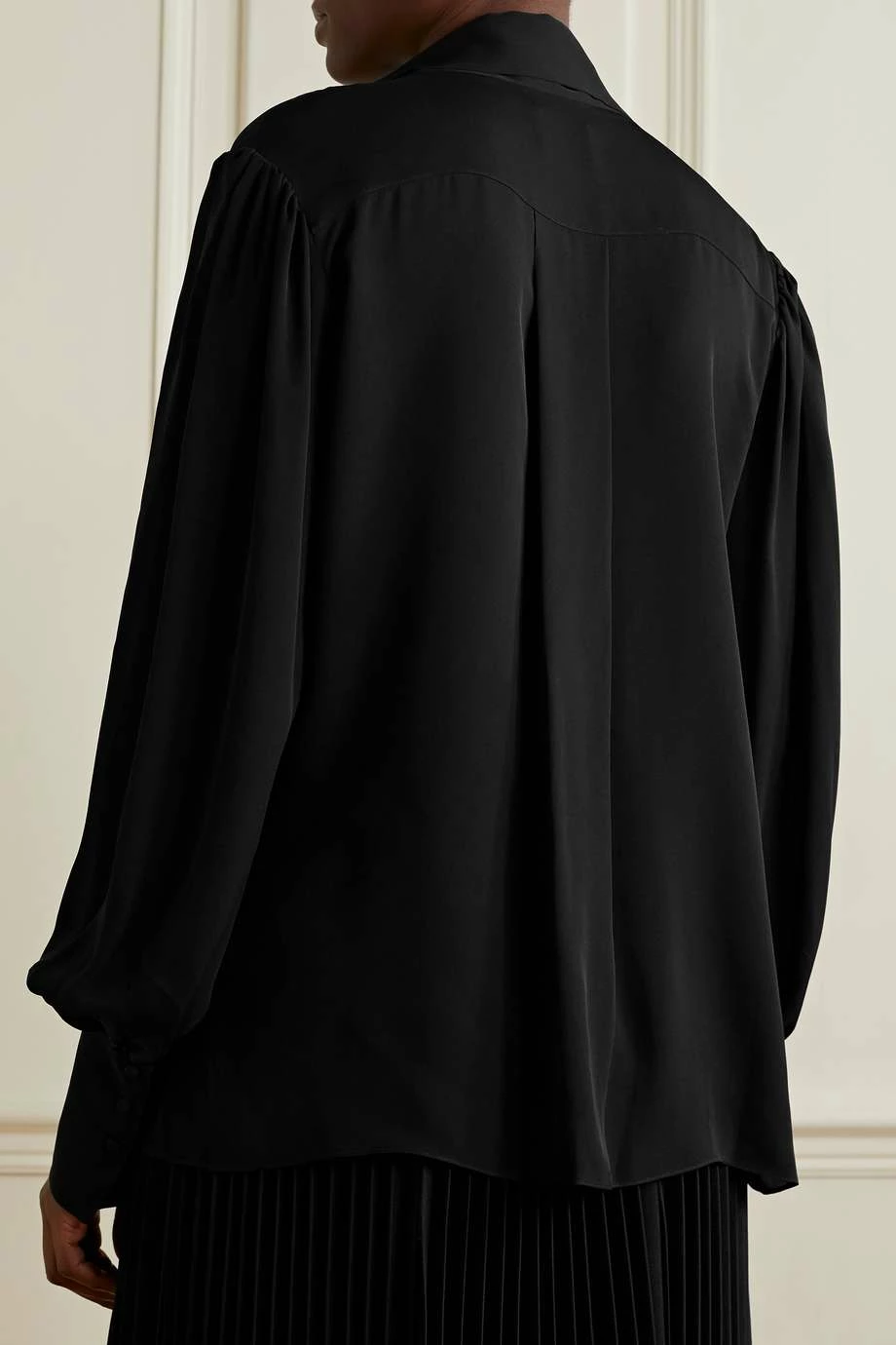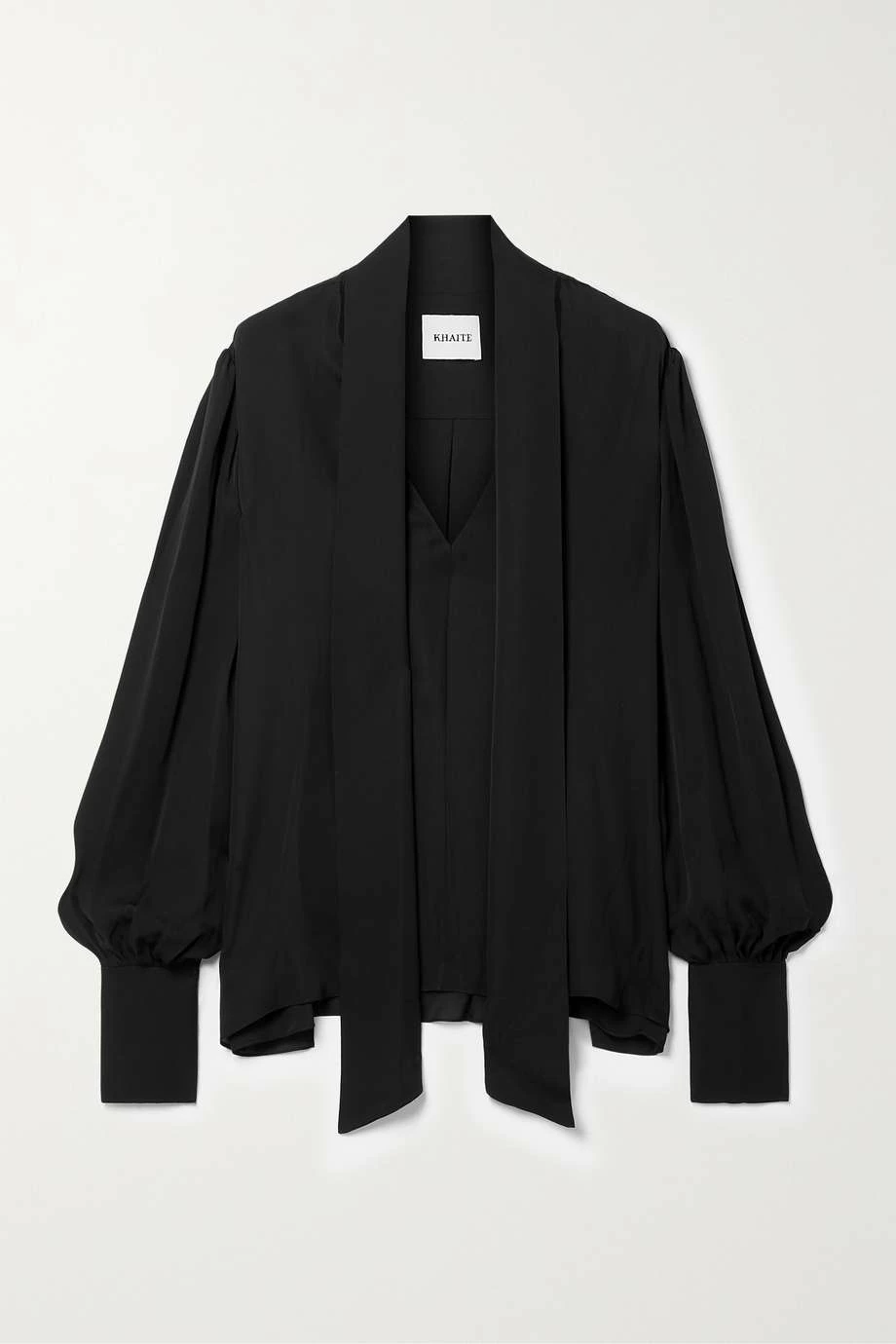 Khaite’s ‘Francisco’ blouse is designed with a fluid scarf that can be tied into a bow, left to drape or removed completely, depending on your preference. It’s made from lightweight silk-georgette in a relaxed silhouette enhanced by a back box pleat. The billowy sleeves taper to buttoned cuffs.
