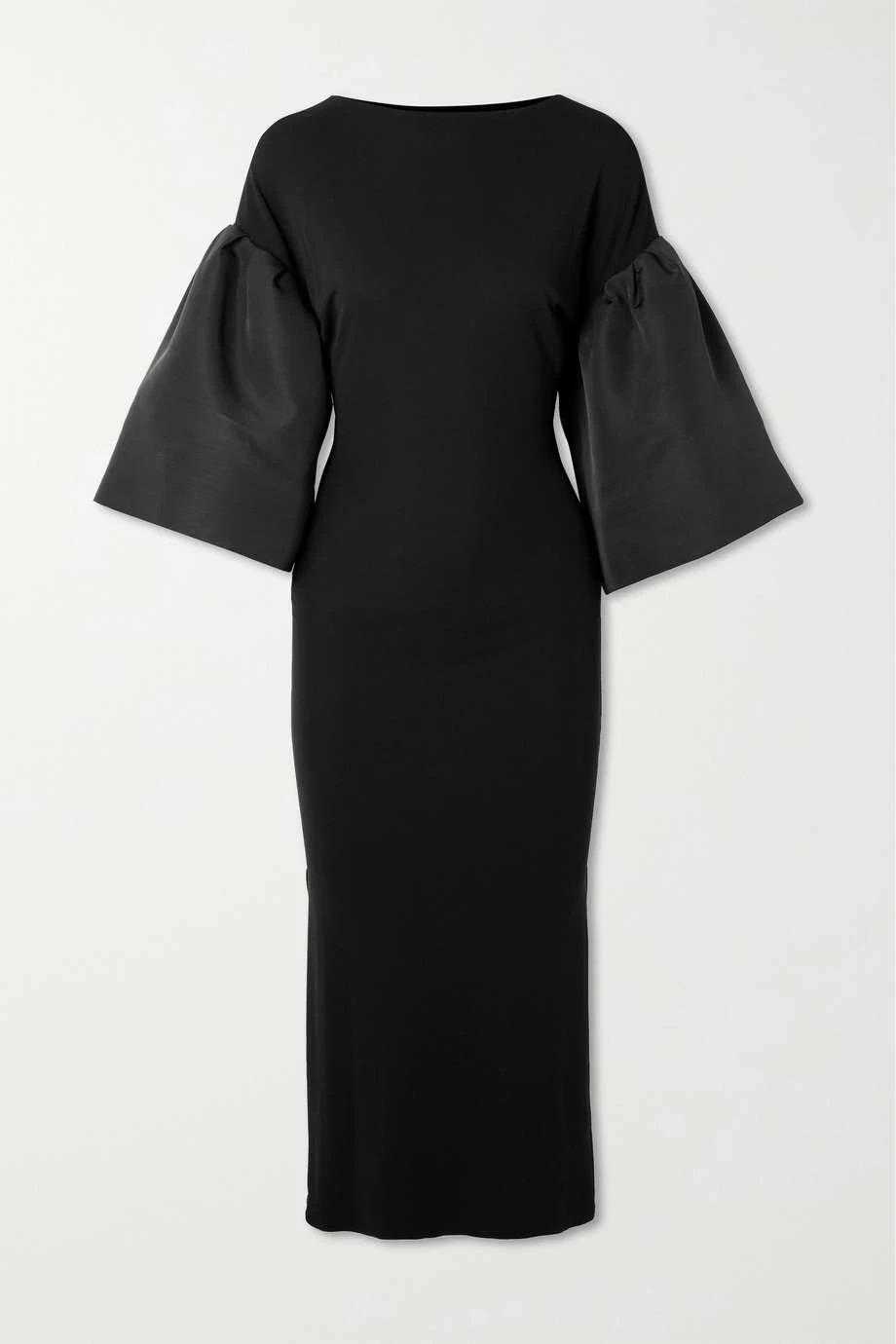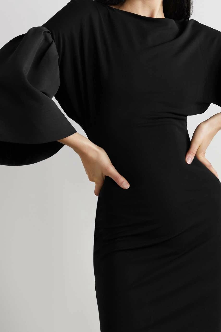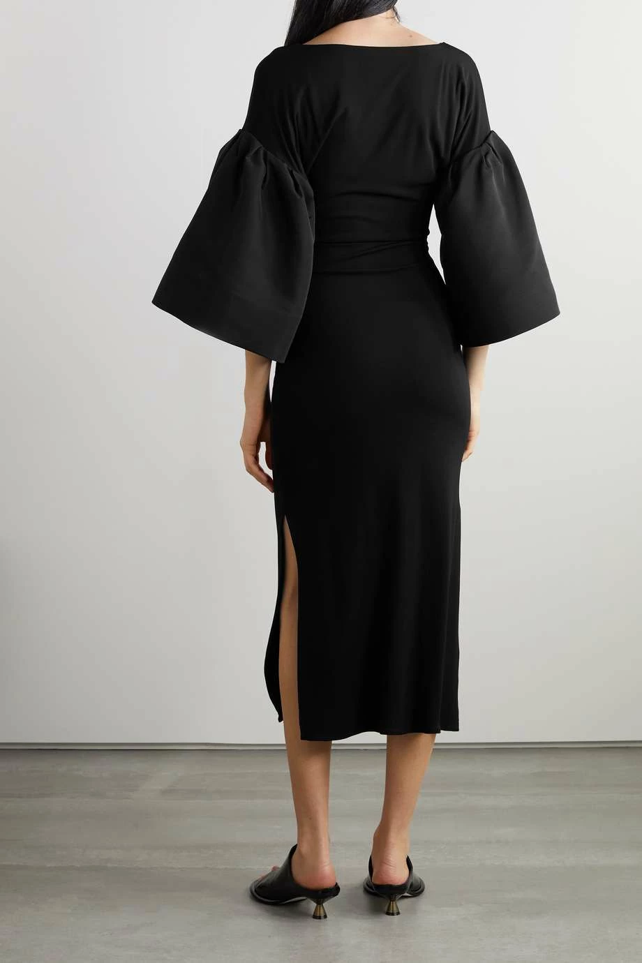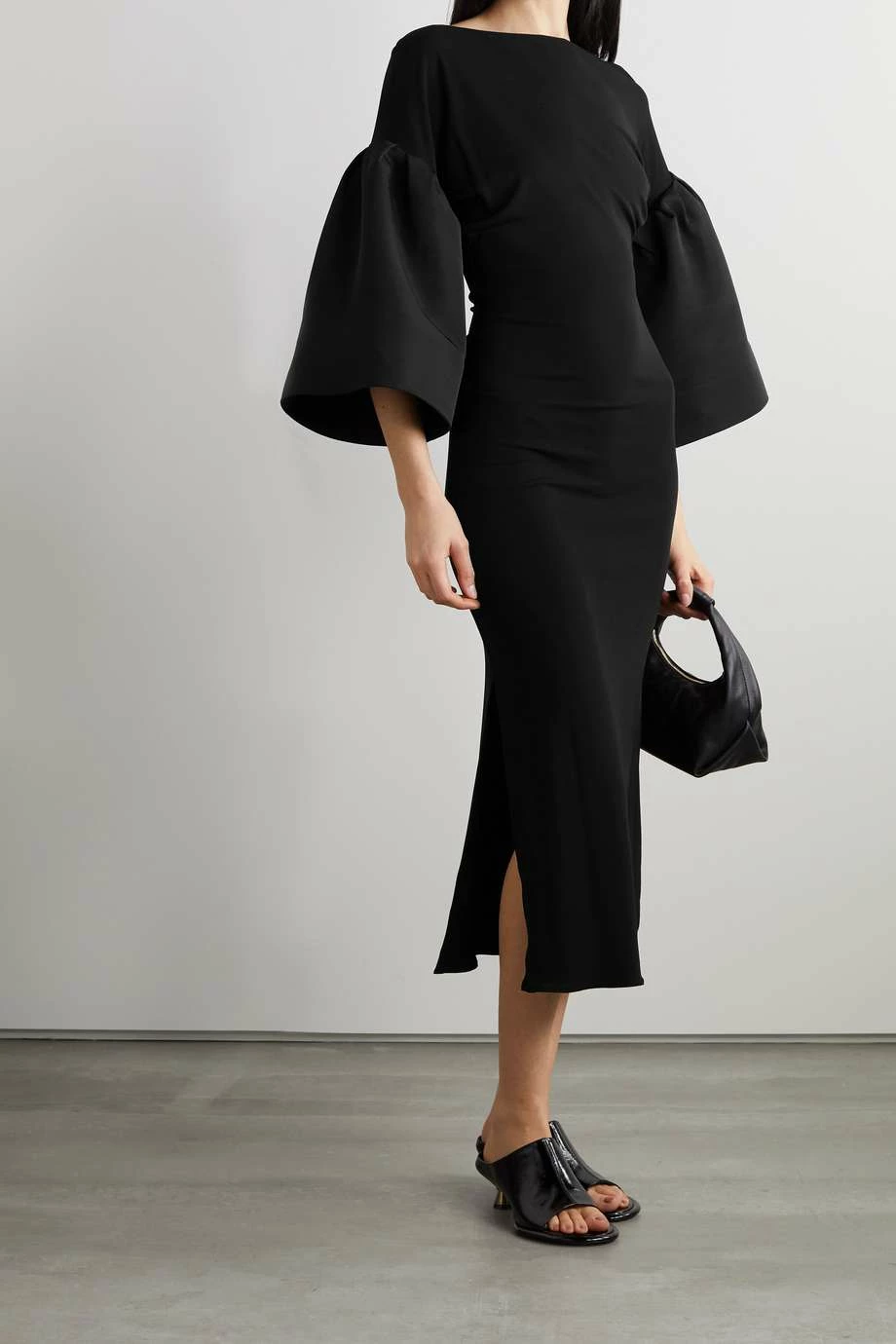 Khaiteโs interpretation of the little black dress is sculptural and sleek. Designed with exaggerated crepe sleeves, it’s made from figure-skimming jersey in a slim silhouette with a bateau neckline and split midi hem. Wear yours with the label’s mules.