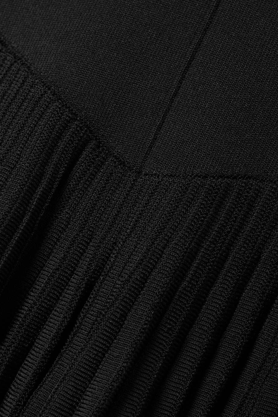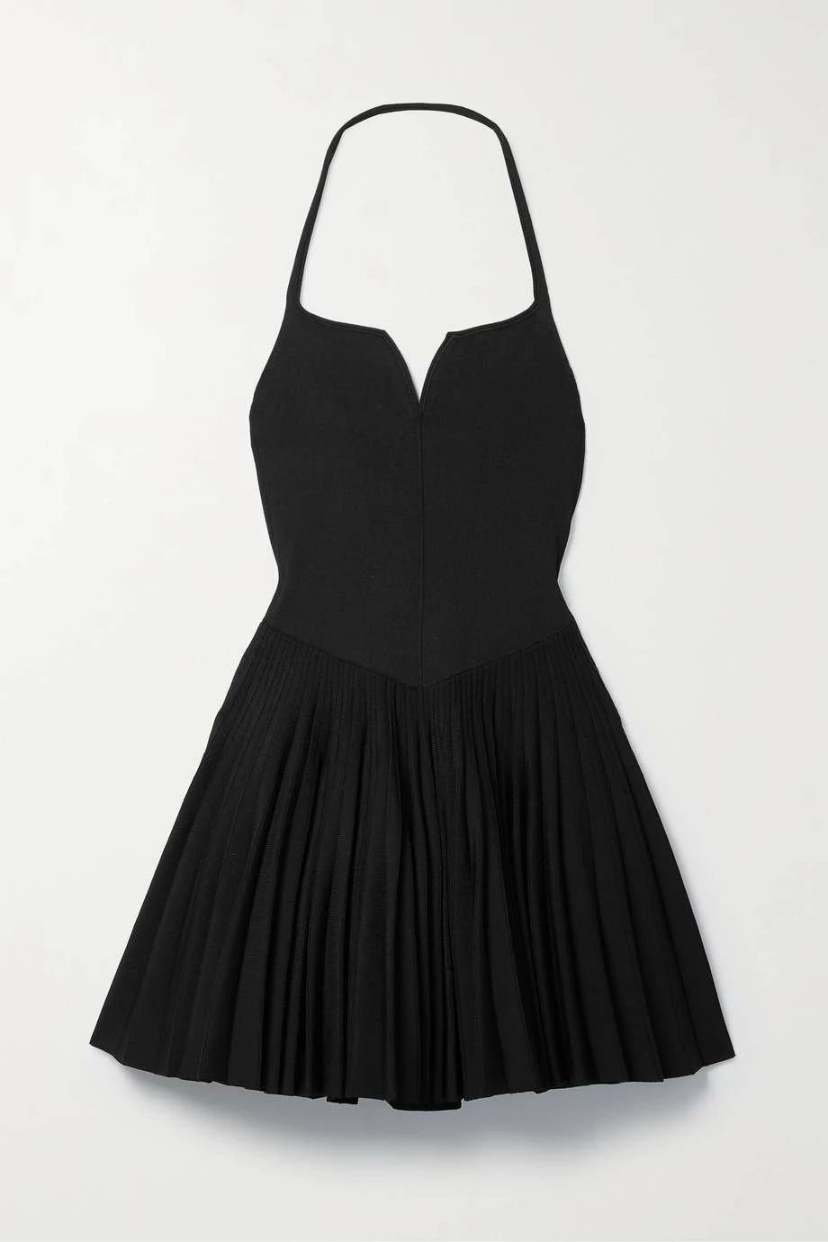 Khaite’s ‘Kaye’ mini dress has a vintage yet modern vibe. Made from black stretch-knit, it has a fitted bodice with a dropped waist that falls to a swishy pleated skirt, along with a halter neckline that reveals an open back.