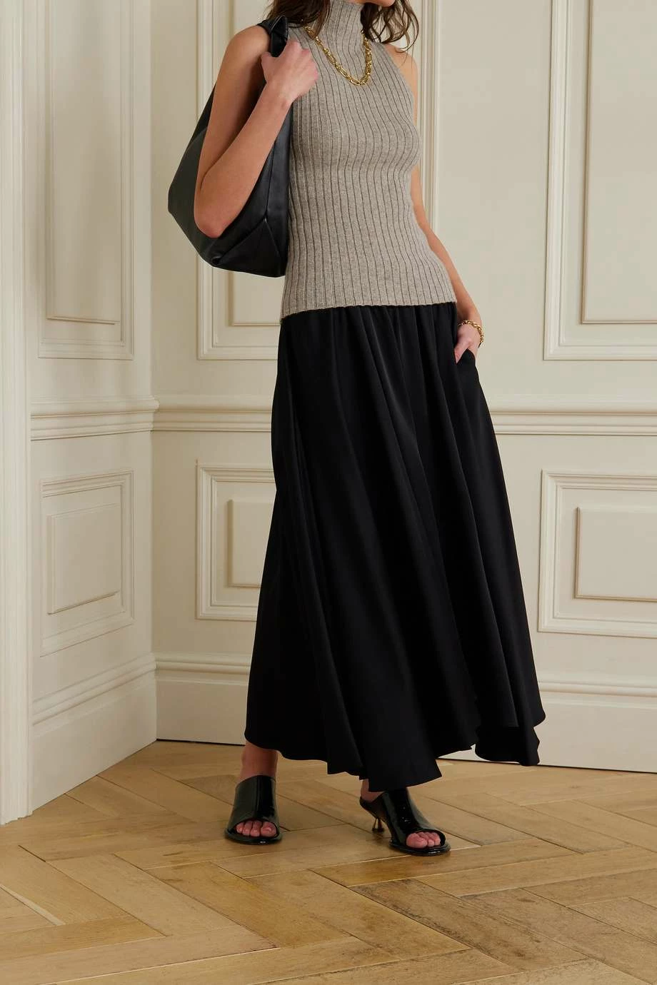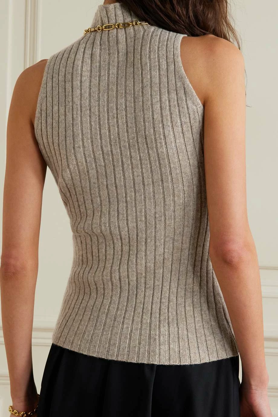 Khaite’s ‘Jolene’ sweater has a minimal design that enhances its versatility. It’s knitted from soft mushroom cashmere with a ribbed finish that accentuates your curves and has a fitted turtleneck. Style yours with a pair of slouchy trousers or a floaty skirt.