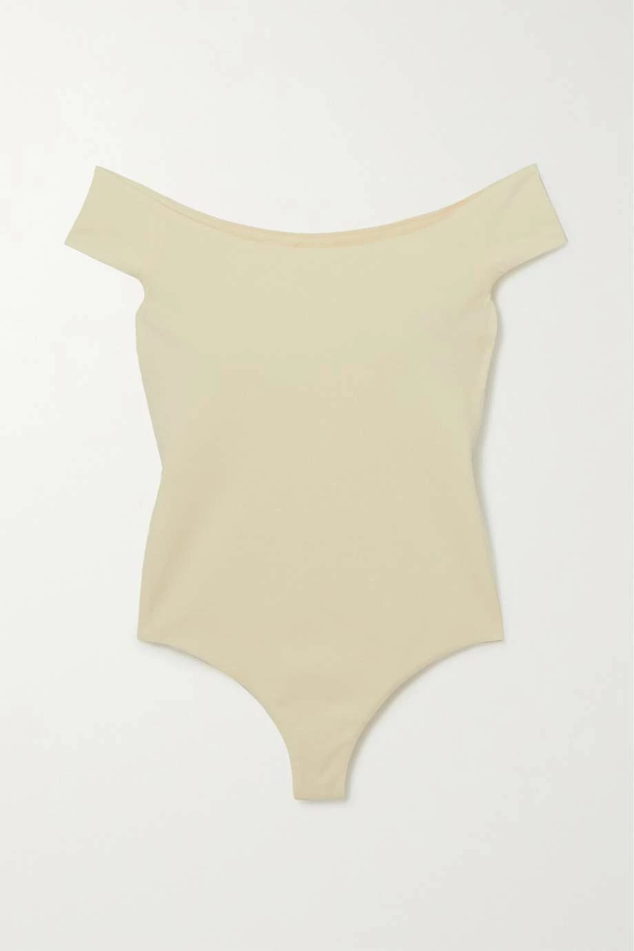 The beauty of Khaite’s ‘Nima’ thong bodysuit lies in its endless versatility. Designed to create a sleek and streamlined silhouette, it’s made from stretchy cotton-jersey and sits off the shoulders. Our stylists like it best with relaxed separates and slides.