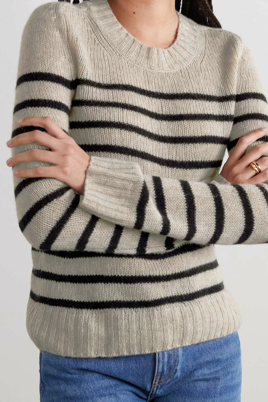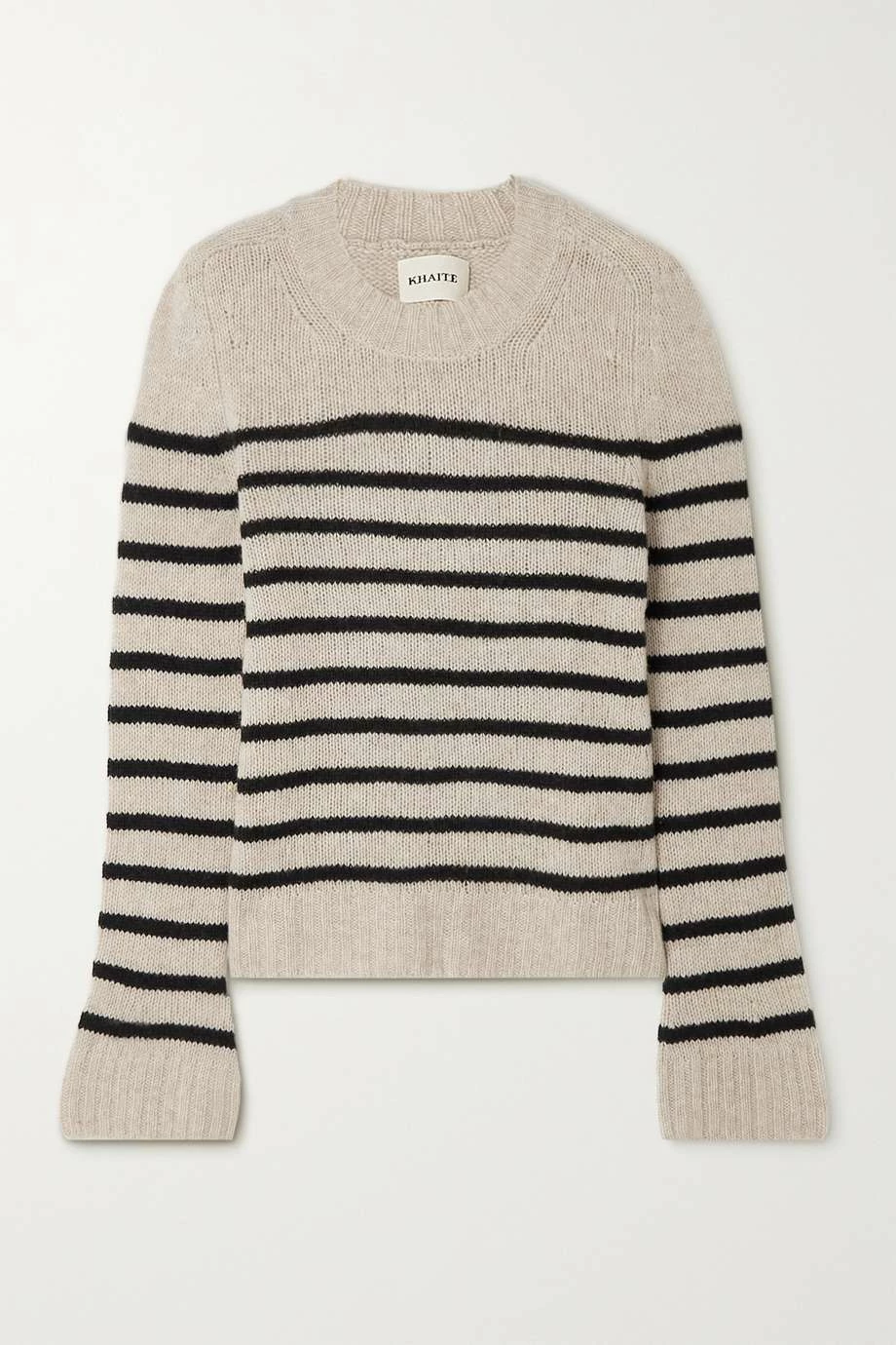 There’s no limit to the number of ways you can style a classic striped sweater like Khaite’s ‘Tilda’ design. It’s knitted from warm cashmere and has chunky ribbed trims. The beige and black colorway is so classic.