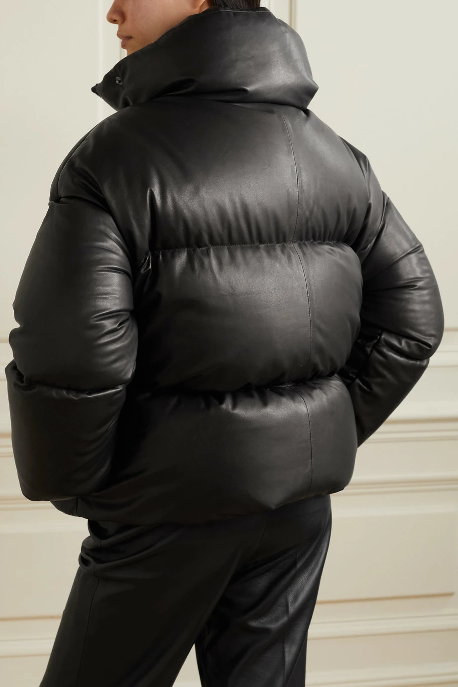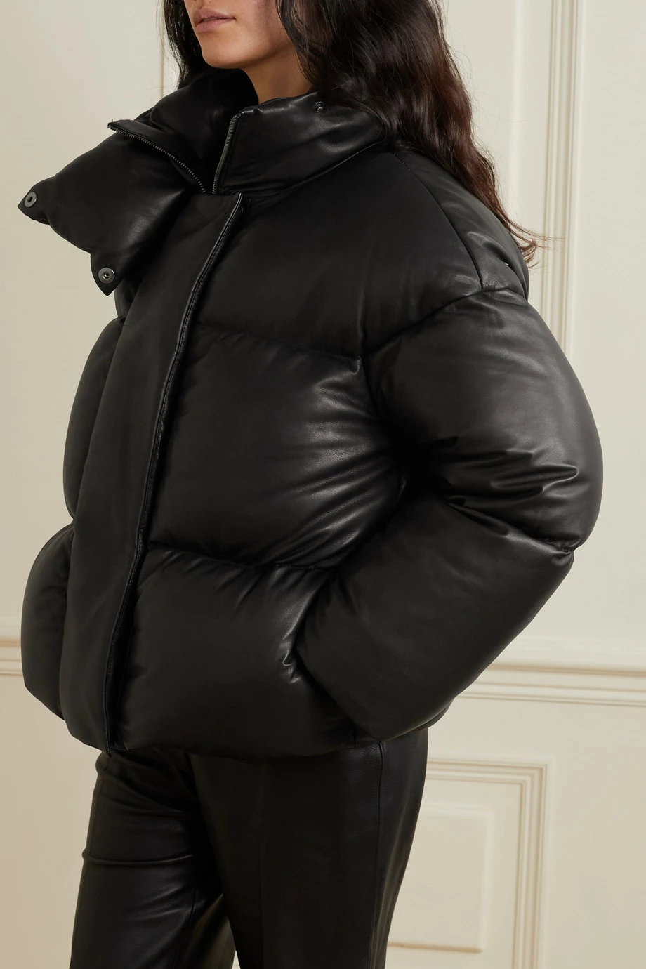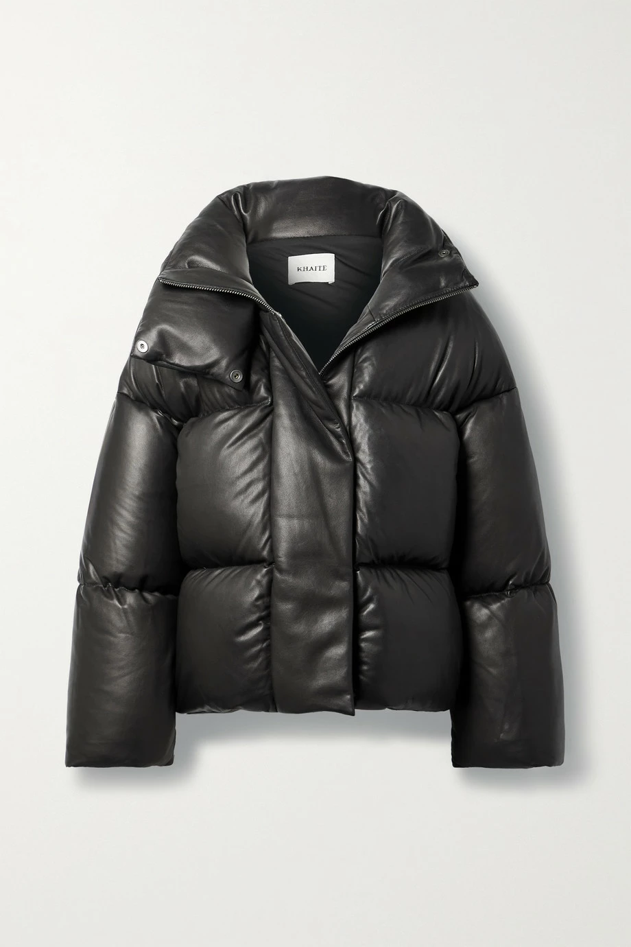 For Fall ’21, Khaite re-imagines the coveted puffy jacket in fresh materials – this ‘Raphael’ style is cut from leather with a subtle shine and softness. The quilted silhouette is filled with insulating down and has a high, funnel neckline that creates a padded collar when unzipped. Wear it with feminine dresses or tailoring for cool juxtaposition.