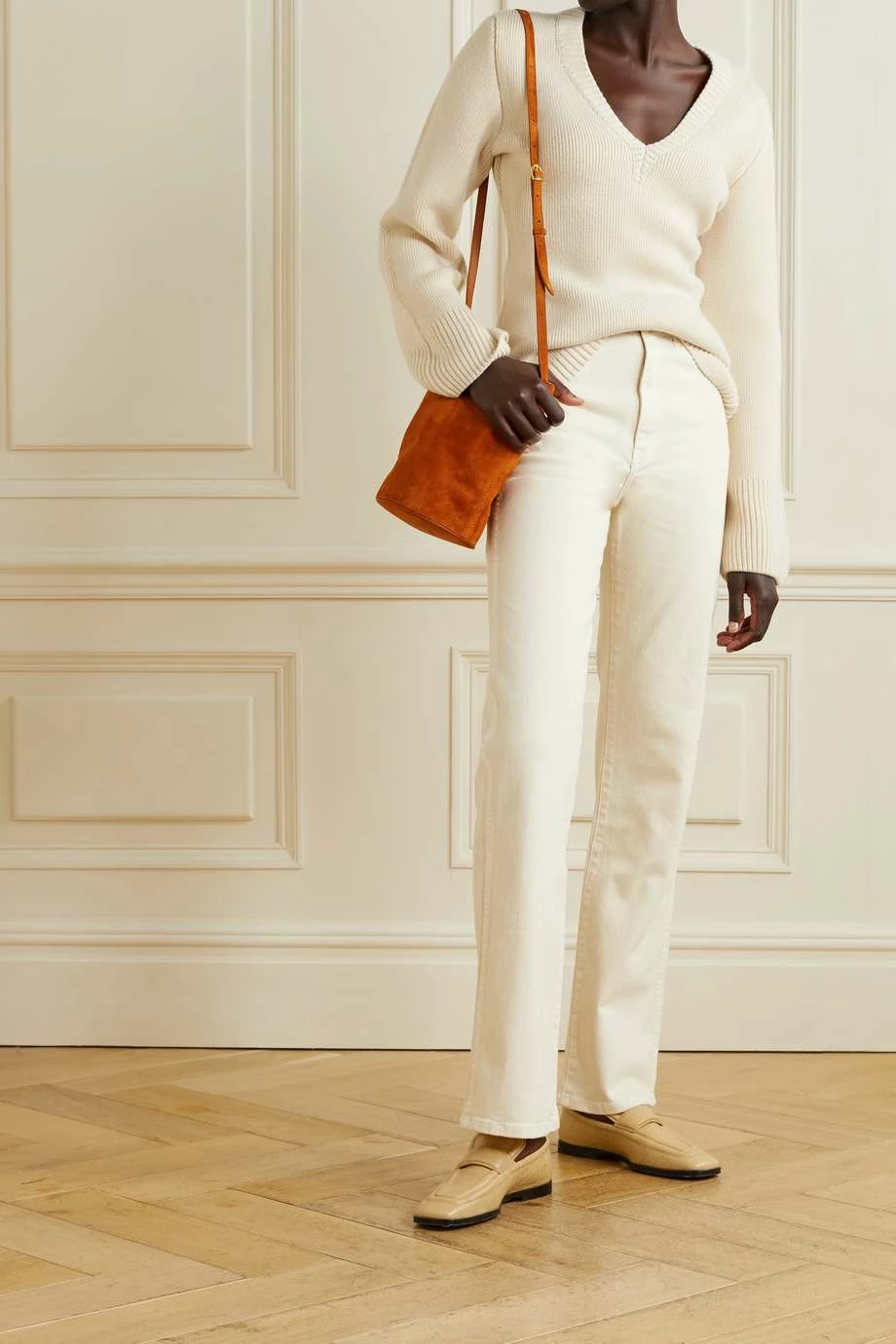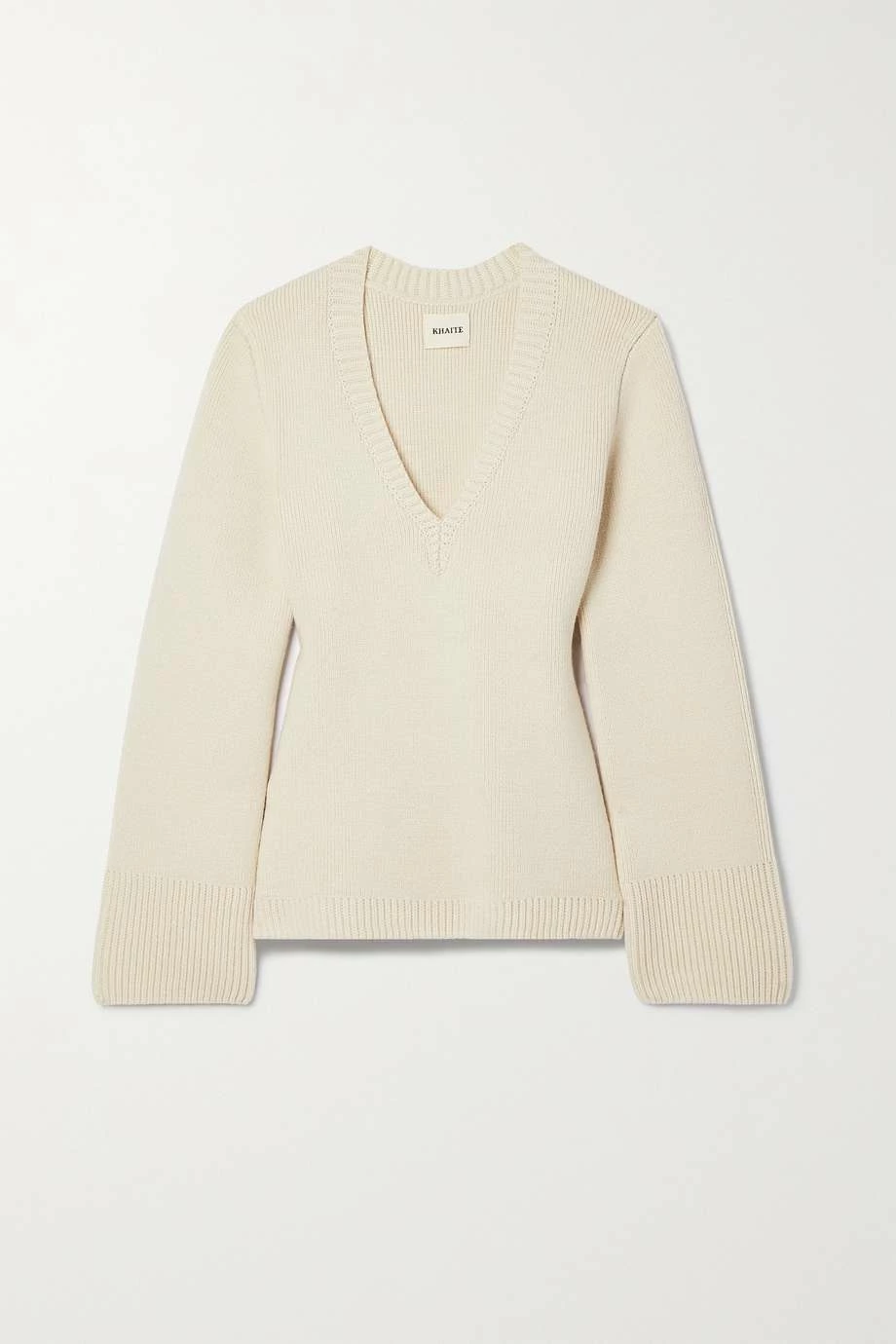 Khaite’s ‘Claudia’ sweater is a cozy, understated piece that will go with nearly everything in your existing wardrobe. It’s knitted from a warm cashmere-blend and has ribbed trims along the V-neck, hem and knuckle-grazing cuffs.