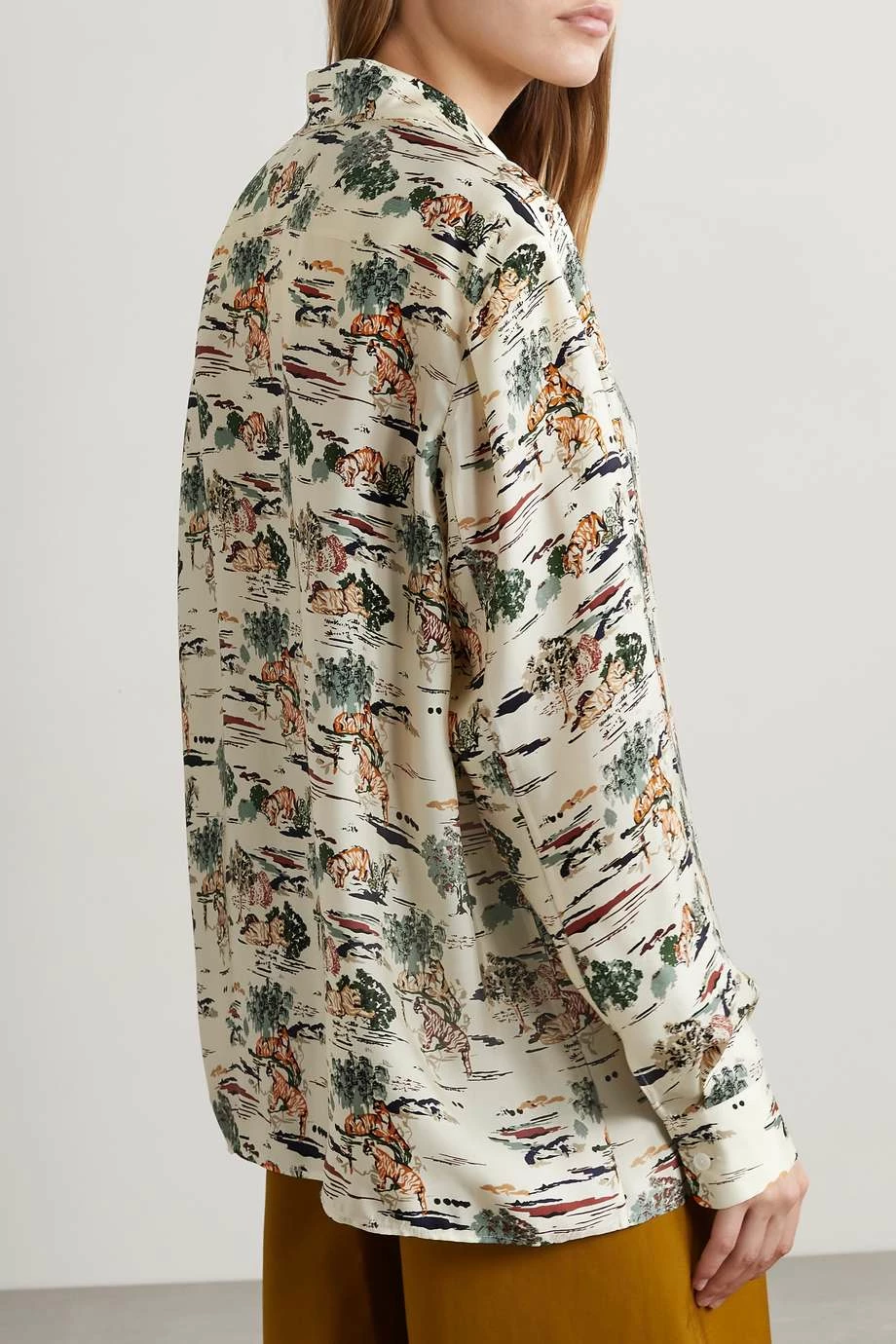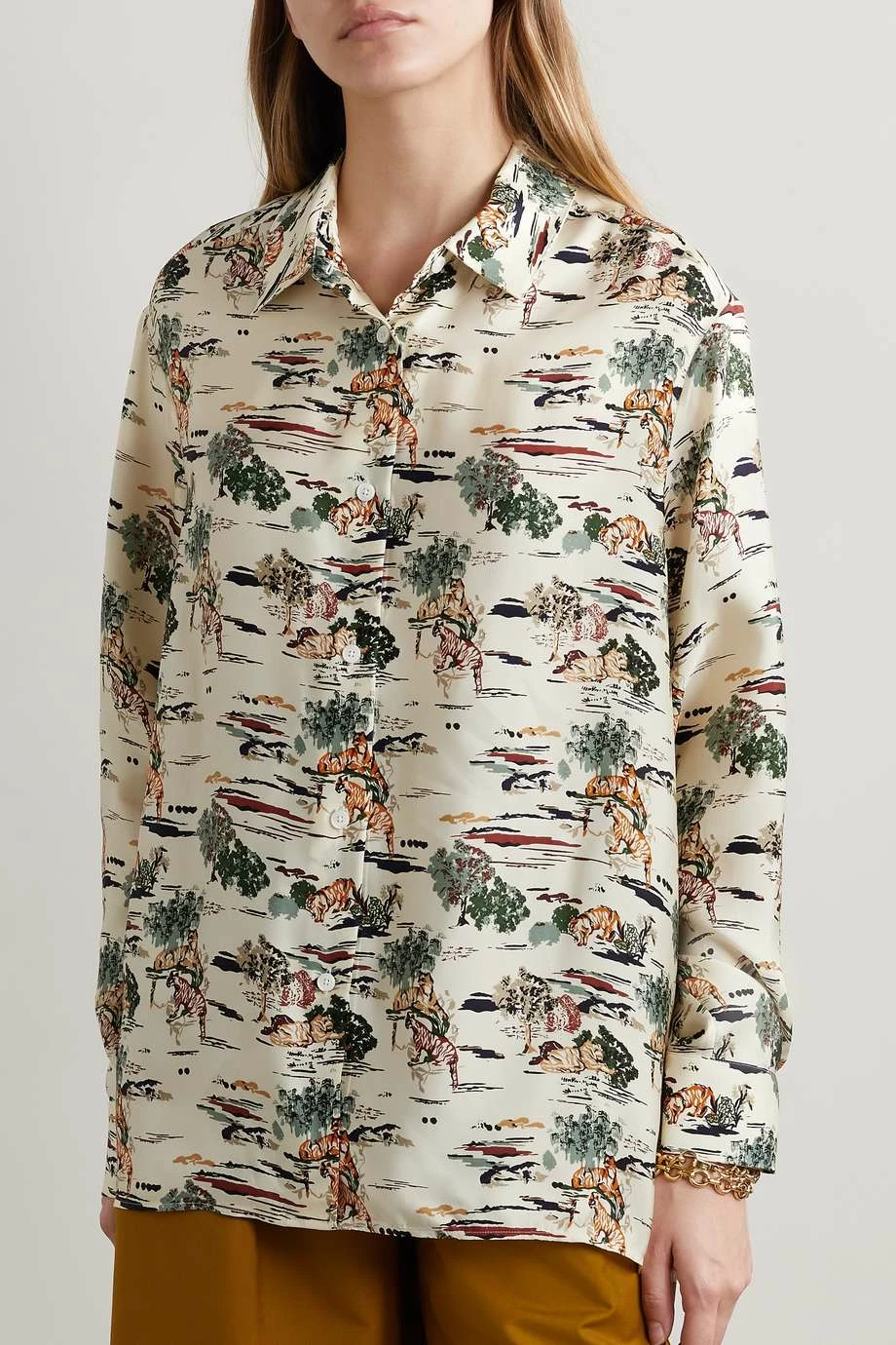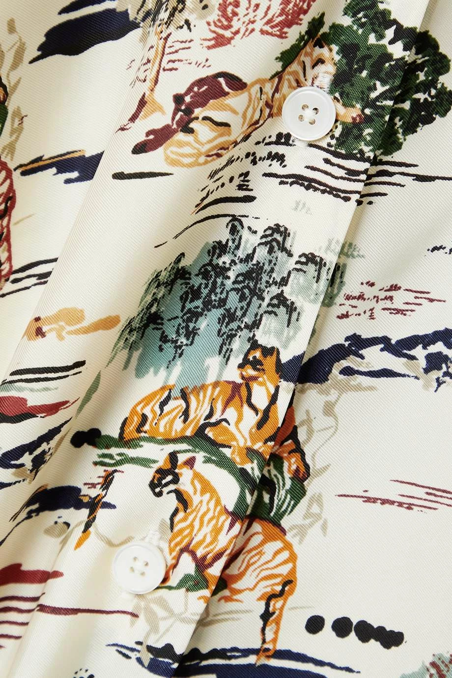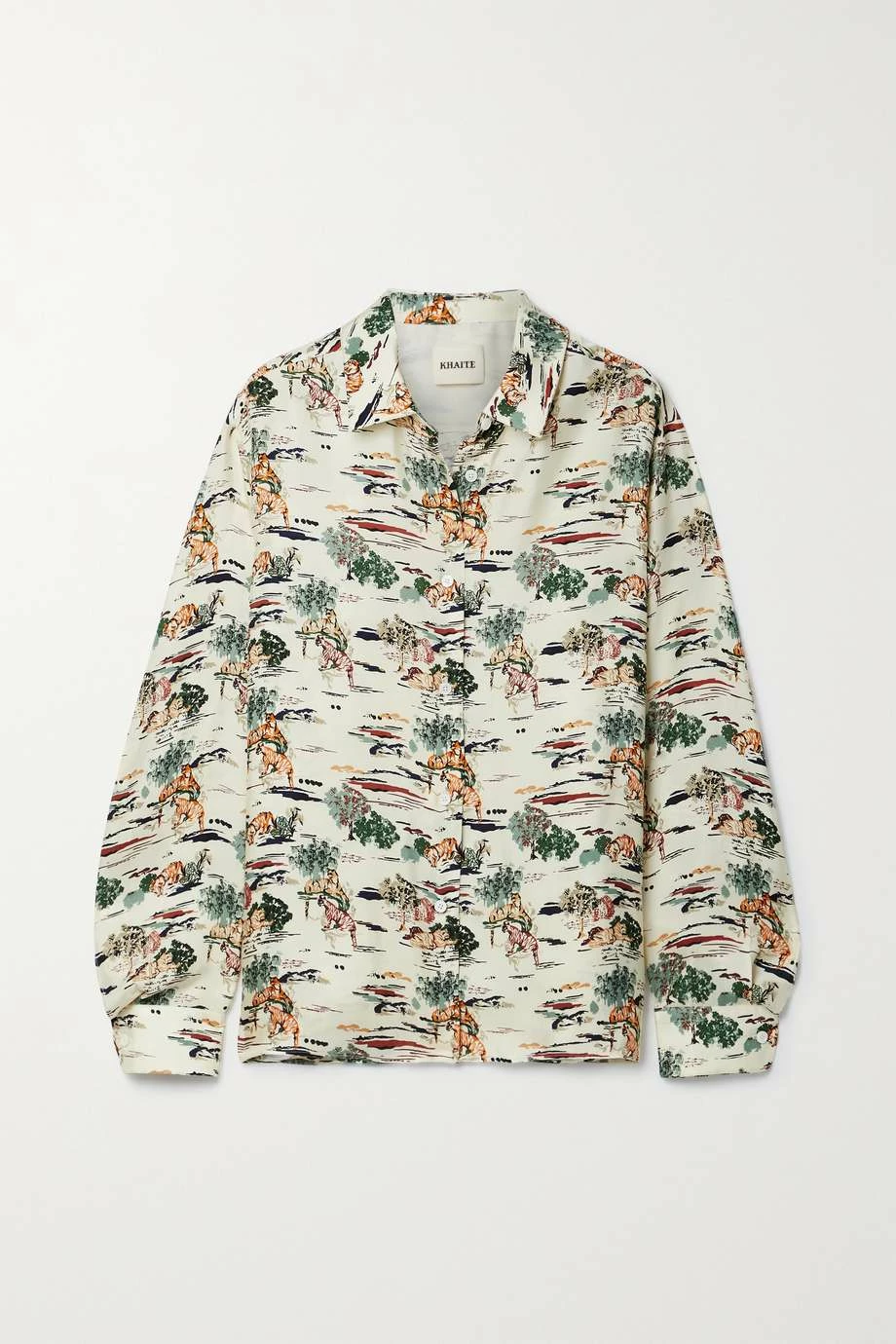 Khaite’s ‘Garo’ shirt is beautifully cut from multicolored silk-twill printed with an abstract safari motif that looks as though it’s painted on. It has a loose silhouette with dropped shoulders and a smart collar. Leave a few of the lustrous buttons undone to create a more laid-back vibe.