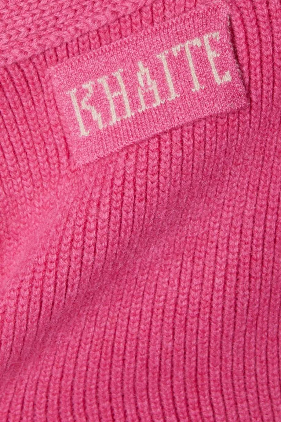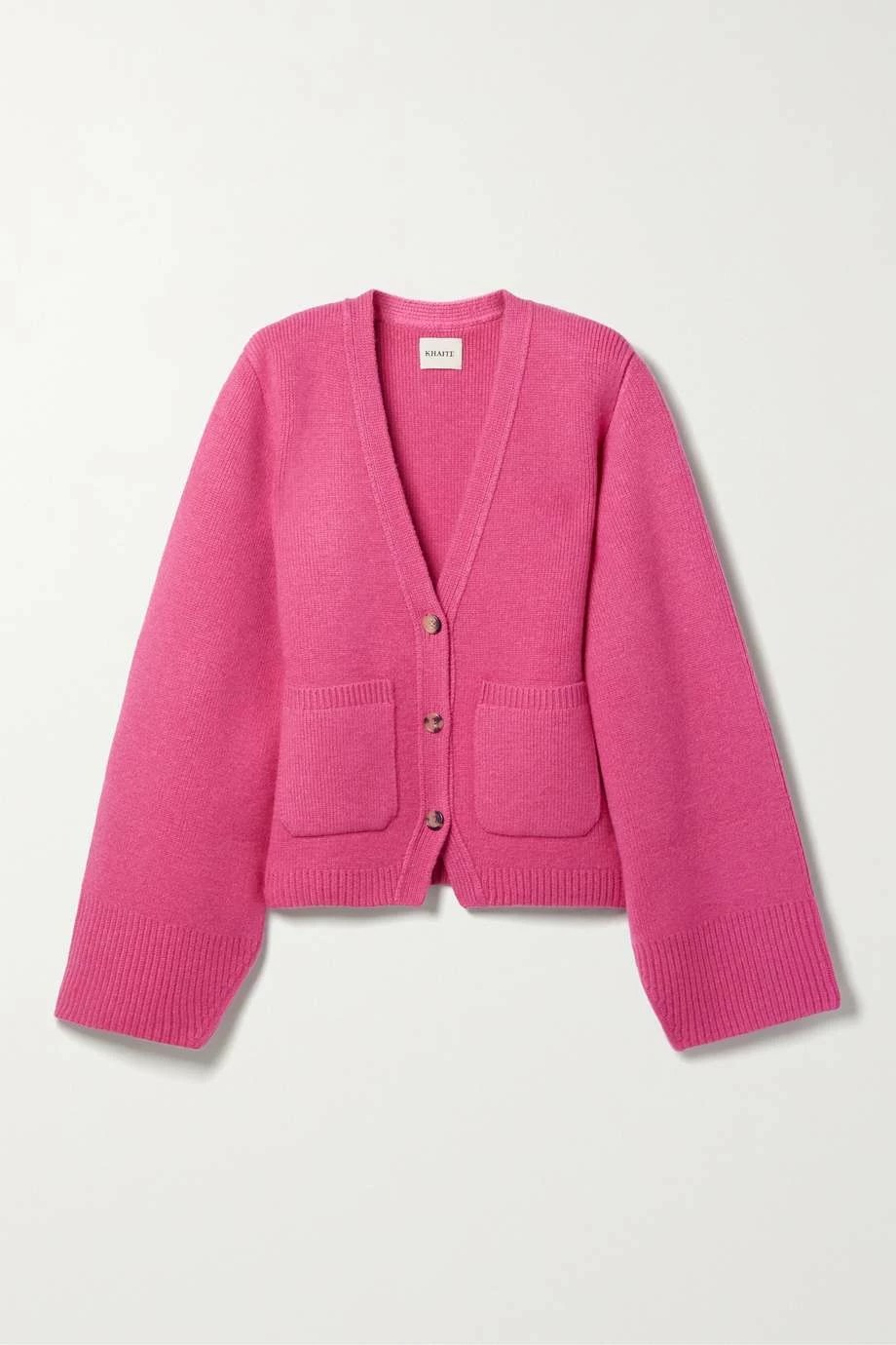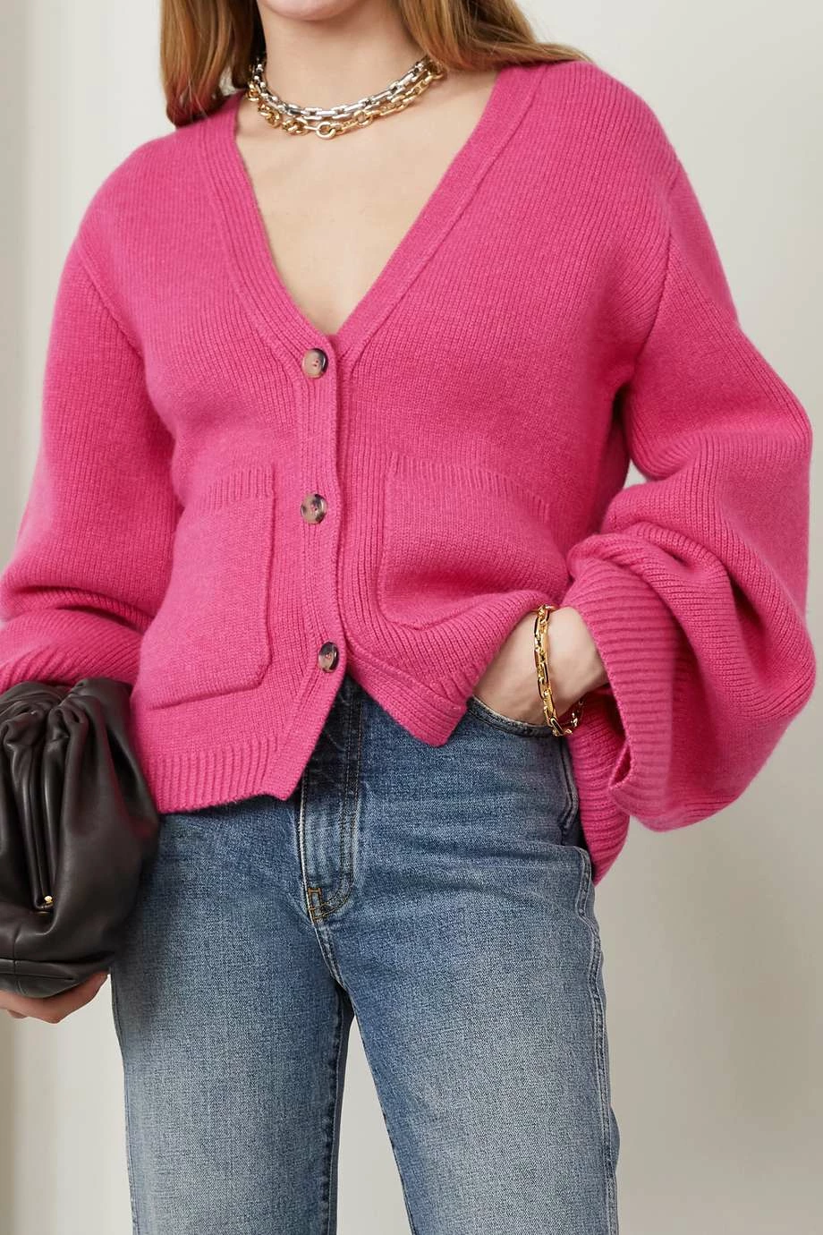 Khaite’s ‘Scarlet’ cardigan is crafted from Mongolian cashmere, specifically chosen for its exceptional softness. Dyed a vivid pink hue, it’s cut for a relaxed fit and has long, knuckle-grazing sleeves and cozy ribbed trims. Wear it with the top button undone, showing off the matching bra.