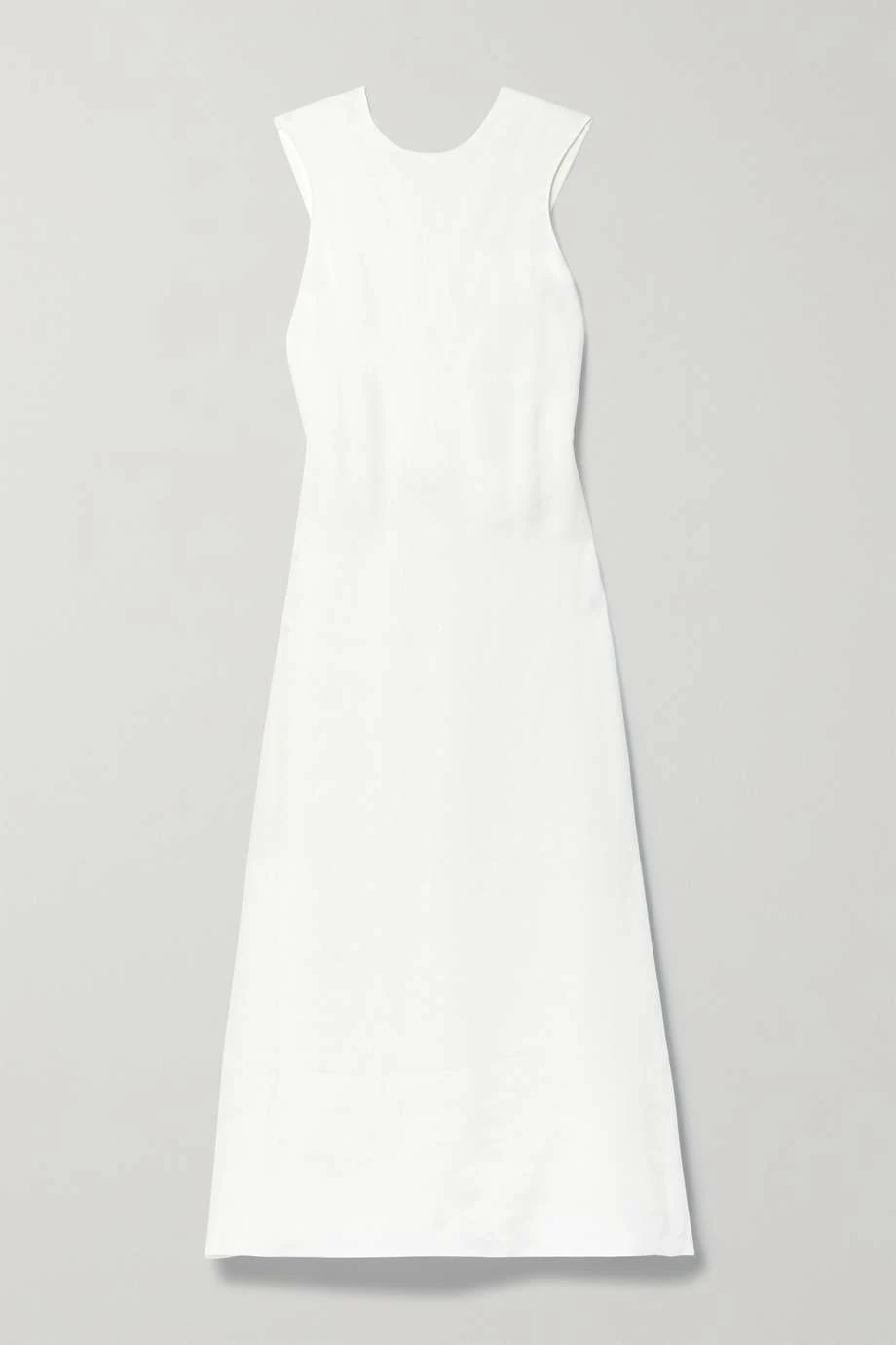 Khaite’s ‘Etta’ dress is beautifully crafted in ivory cotton-blend and has subtle pleats on the skirt for gentle volume. Free of closures, there is a great intersection of fabric on the back that suspends the entire piece. Wear yours with mules or embellished sandals.