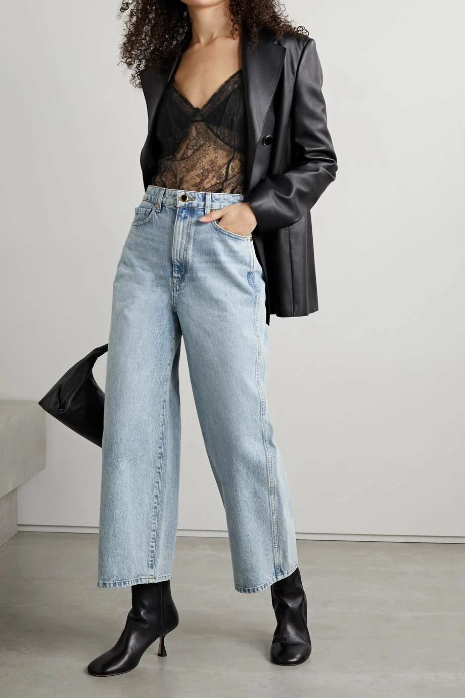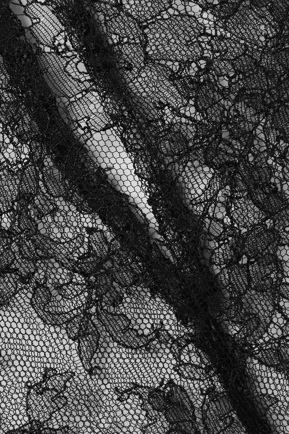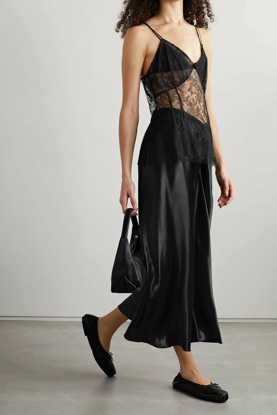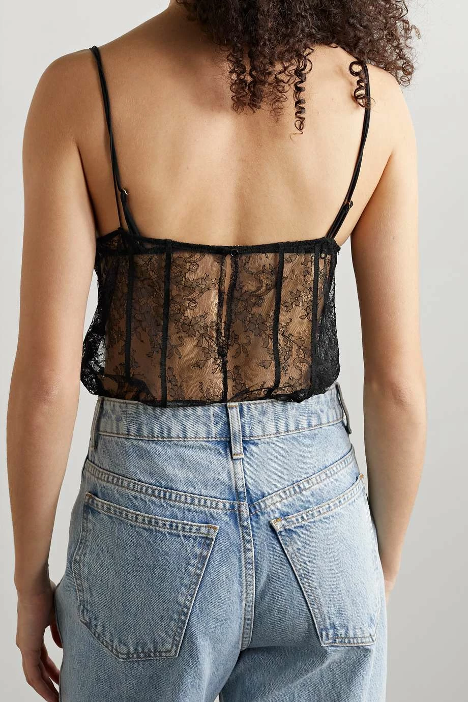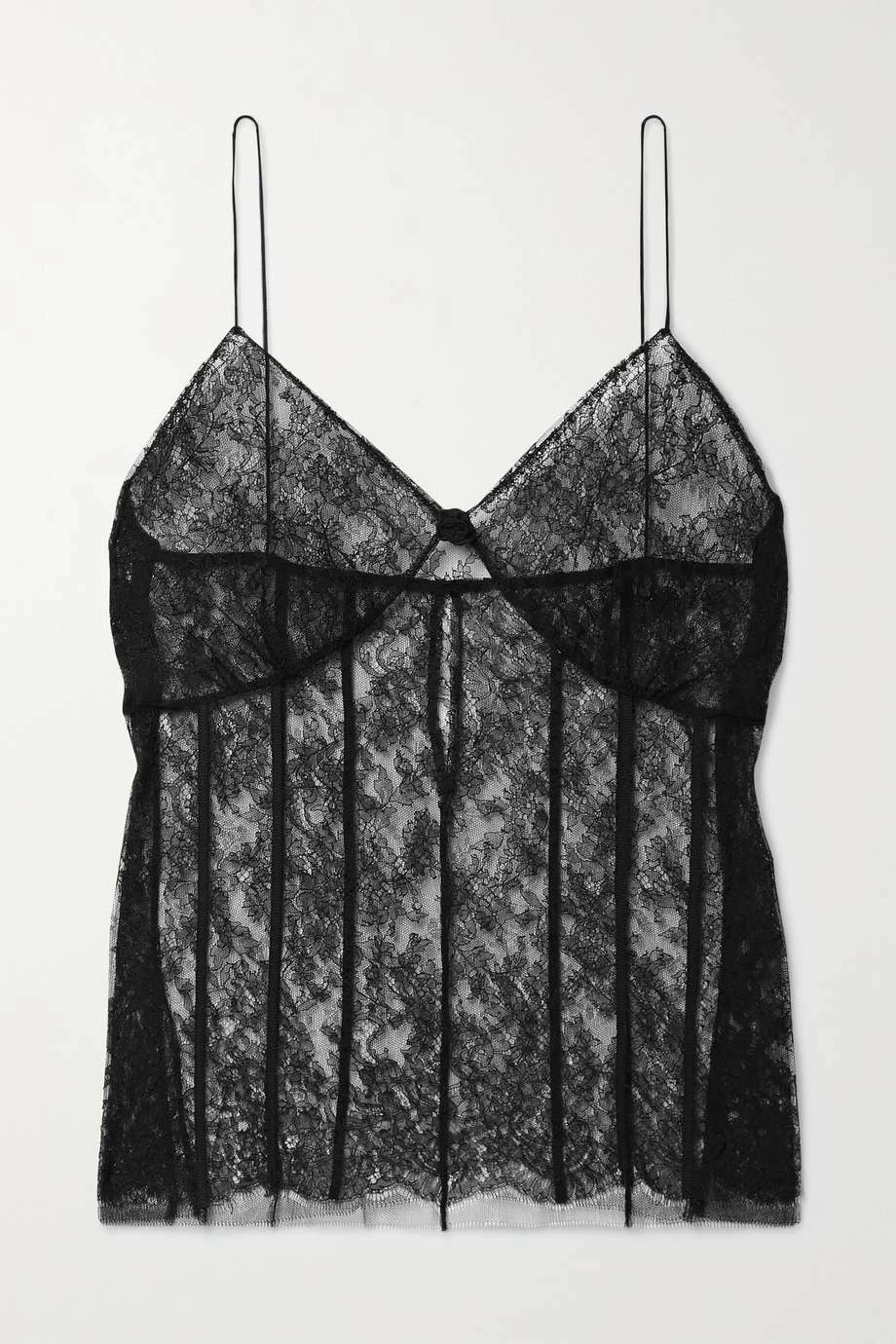 Khaite’s ‘Nano’ camisole is cut from panels of French Chantilly lace with pronounced seams that mimic corsetry. It has a V-neckline centered by a rosette and suspends from pin-thin straps before falling to a scalloped hem. Underpin yours with self-adhesive cups or petals.