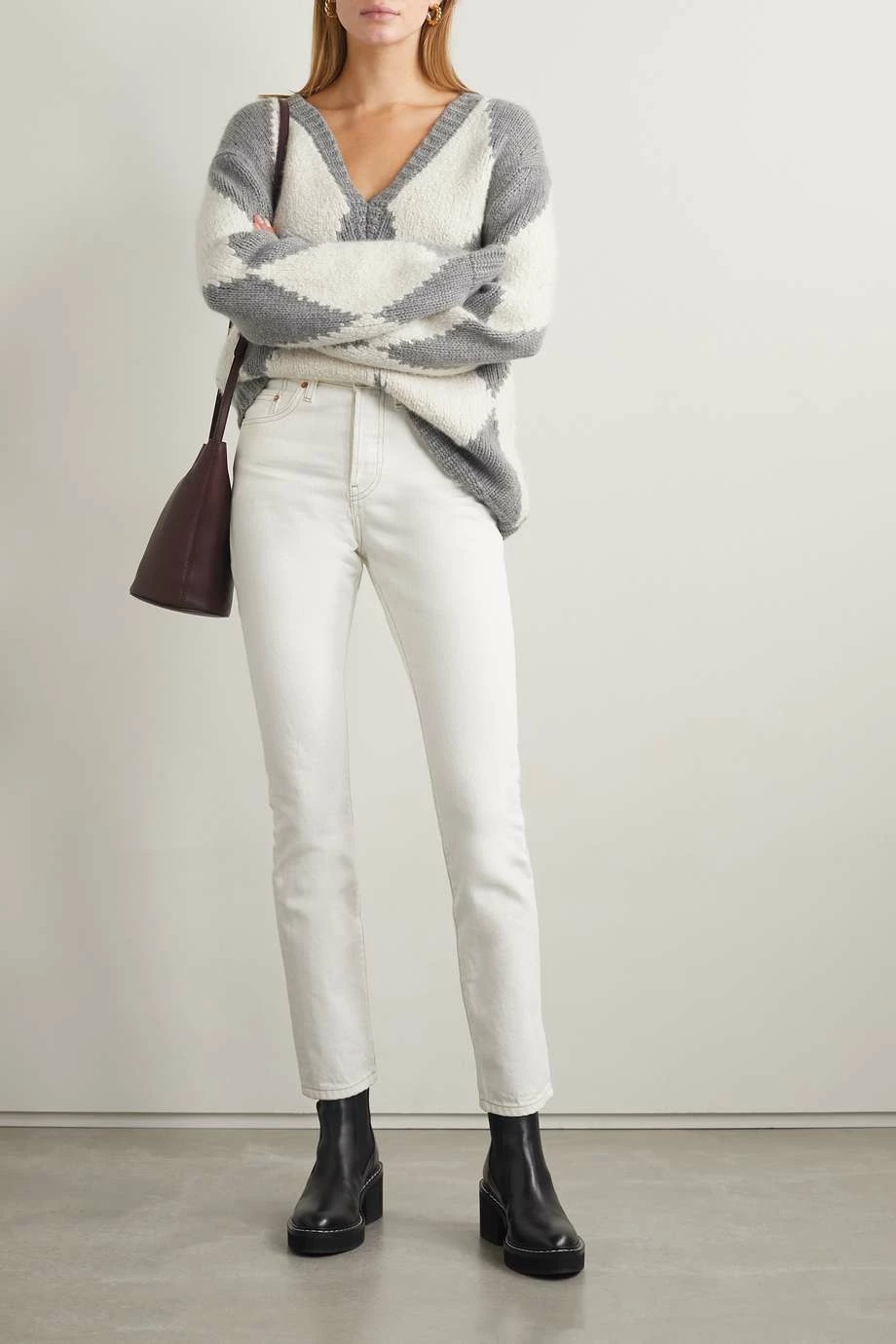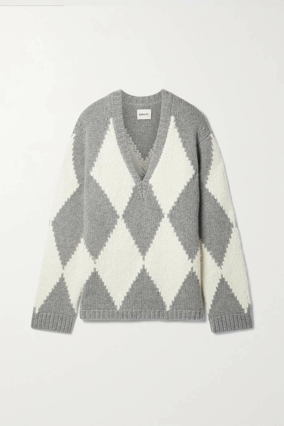 Khaite’s ‘Valerie’ sweater is made from soft cashmere knitted in a neutral argyle pattern. It’s designed for a loose fit enhanced by dropped shoulders and a deep, ribbed V-neck. Wear yours solo with jeans or layered over a turtleneck.