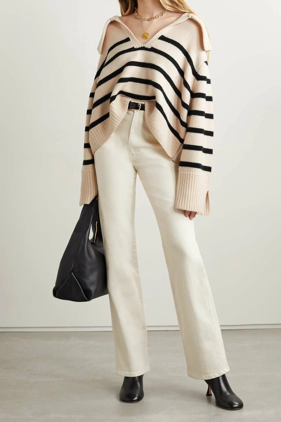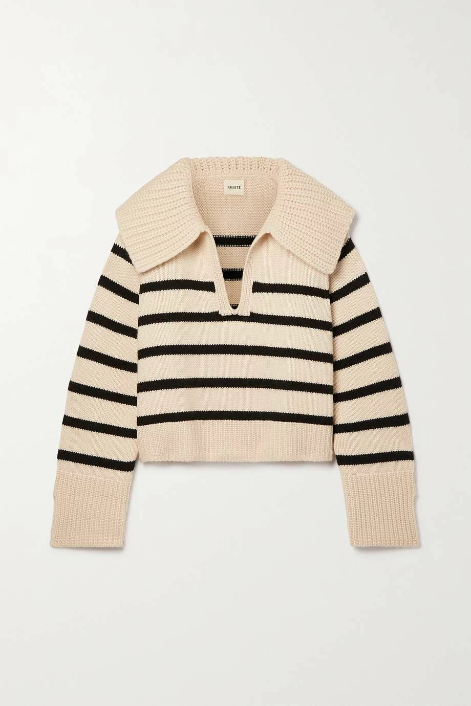 A lesson in how to nail exaggerated proportions, Khaite’s ‘Evi’ sweater is designed in an oversized silhouette enhanced by a dramatic polo collar that drapes over the shoulders. It’s made from plush cashmere with contrasting Breton stripes and has split cuffs. Wear yours partially tucked into jeans or tailoring.